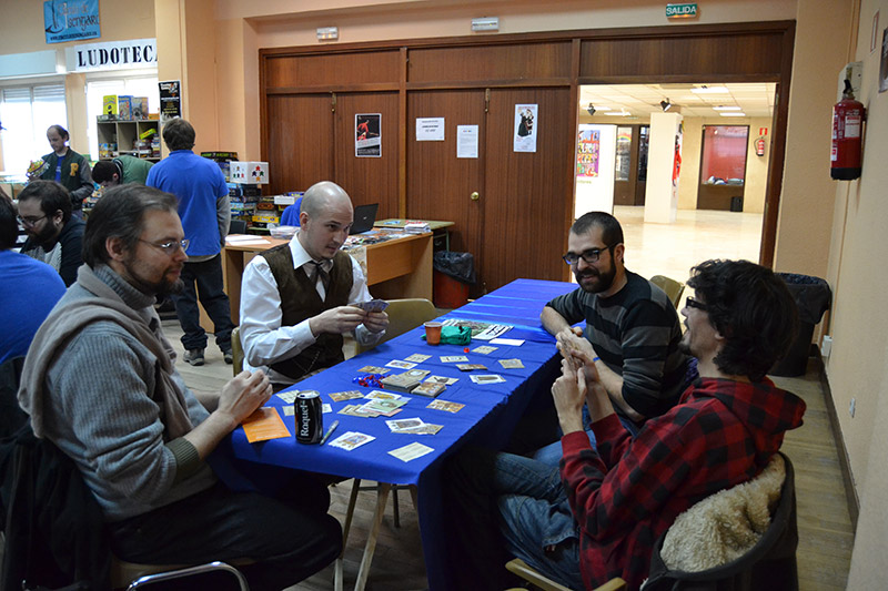 Tanto el sábado como el domingo, las mañanas resultaron tranquilas, pero a medida que se acercaba el medio día, y sobre todo tras este, un aluvión de visitantes llegaba para llenar por completo las mesas de juego. Aún así, además de infinidad de partidas a Ajo y Agua, tuvimos la oportunidad de probar el magnífico juego 15 Días de Gonzo Brios (ilustrador también del cartel de FrikiGordo de este año, y compañero de batallas en estas y otras jornadas). 15 Días es un entretenido juego de cartas lleno de intrigas palaciegas y alianzas quebradizas con una ambientación muy cuidada, que te sumerge de lleno en la época del Siglo de Oro español.